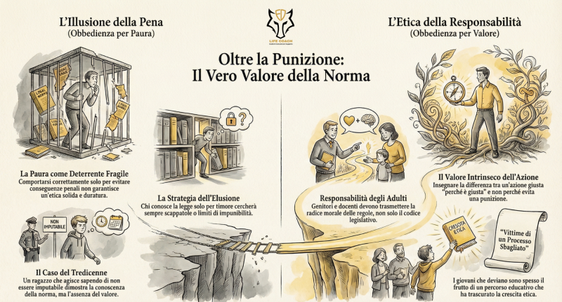 L'idea dominante è: "Non mi comporto male solo perché altrimenti subisco una conseguenza penale". Finché continueremo a basare la nostra convivenza civile esclusivamente sulla paura della norma e della punizione, falliremo. Avremo sicuramente persone che non commetteranno mai reati, ma lo faranno solo per timore, pronte a infrangere le regole non appena troveranno una via di fuga o una scappatoia legale. Le leggi esistono da migliaia di anni, eppure continuiamo a infrangerle proprio perché non ne comprendiamo il valore morale e intrinseco.